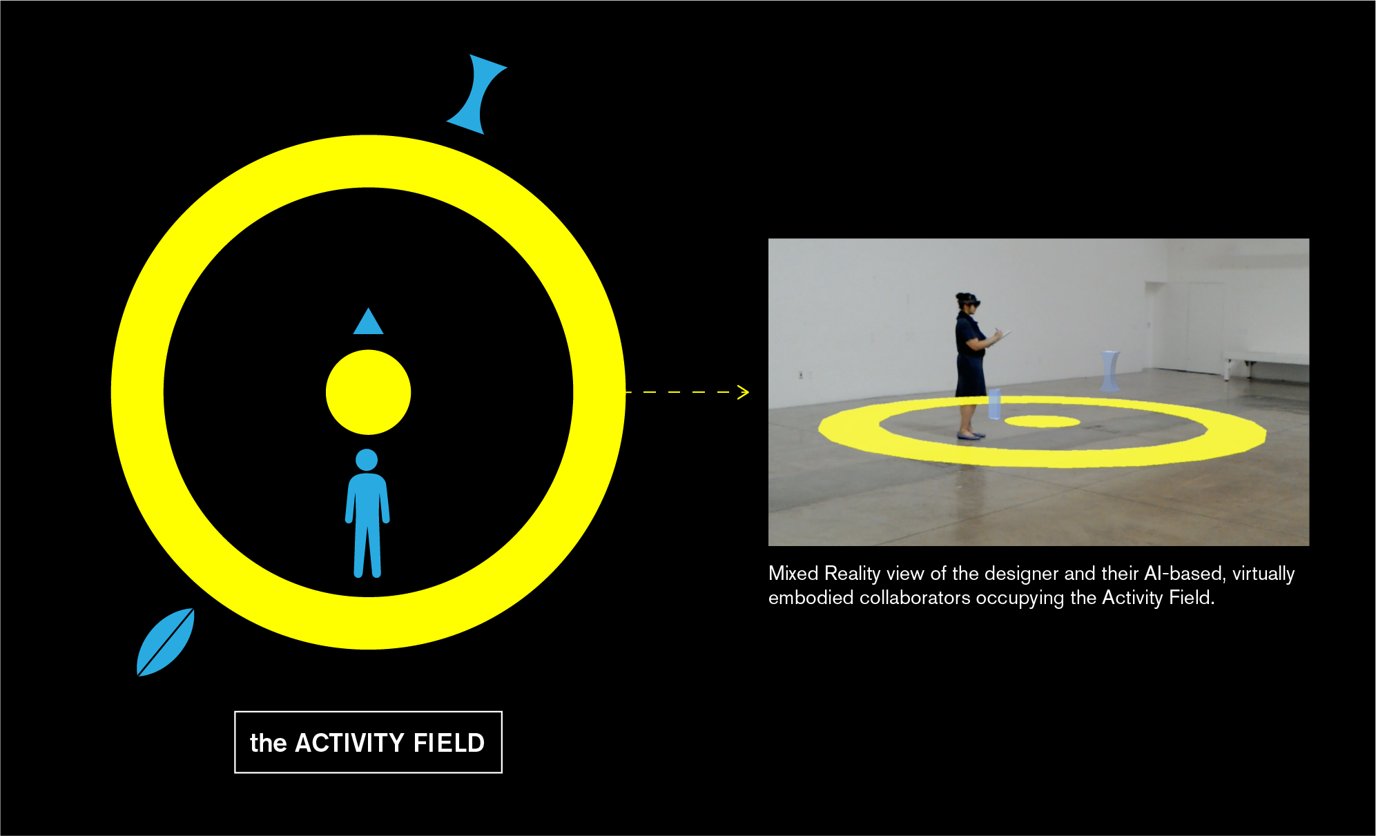 the ACTIVITY FIELDThe ACTIVITY FIELD is a studio space for Mixed Reality. Although it is only visible when the designer is wearing their headset, the Activity Field demands an open physical studio space where the designer can move around in concert with the three virtual collaborators, who inhabit this space.