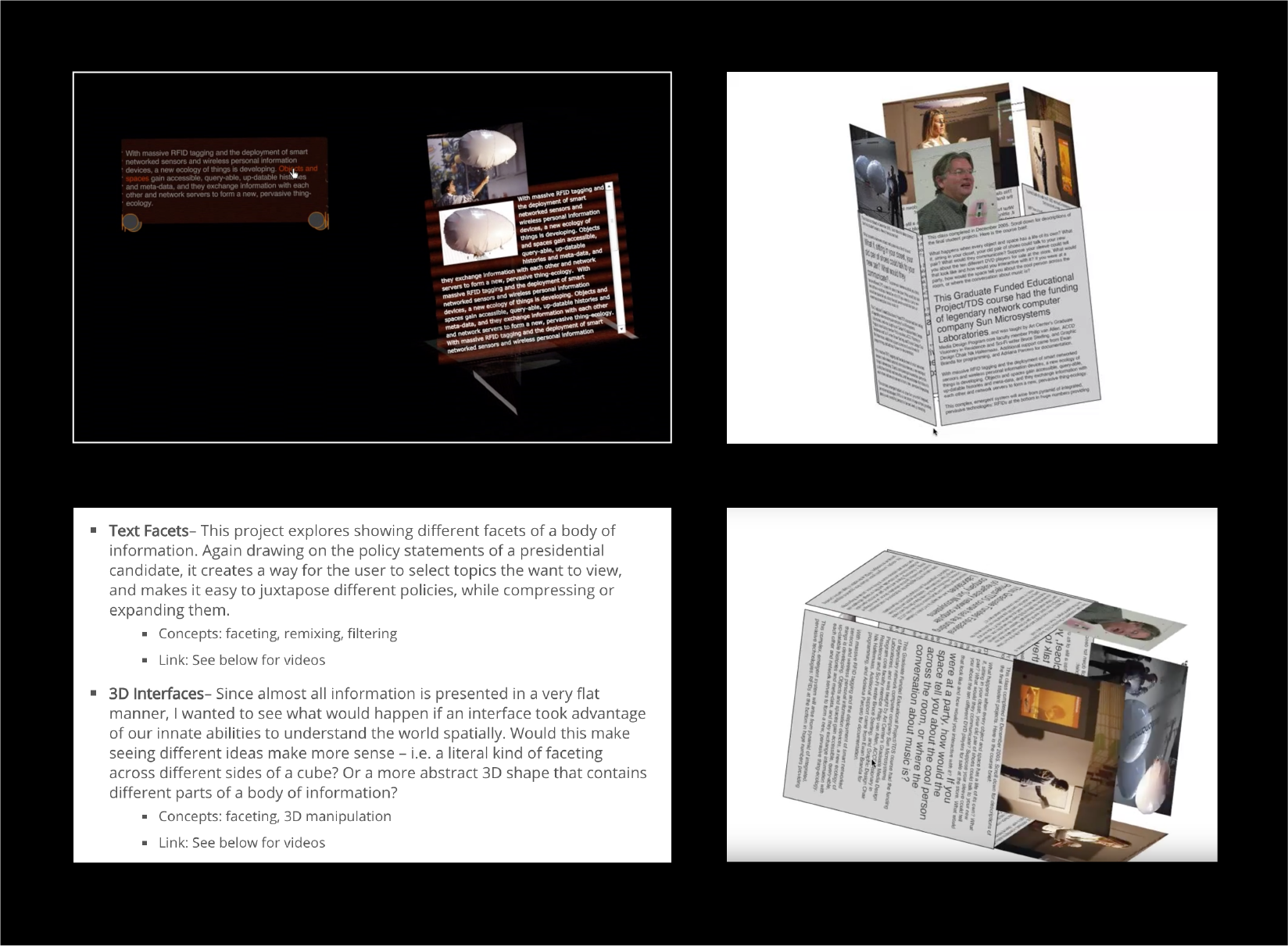I decided to dig deeper into Phil’s existing work and looked at his design experiments on a concept he calls “facets”. Facets create a way for the n-dimensions of a body of information to expand and be accessible in a physical and interactive way. They make information more spatial.