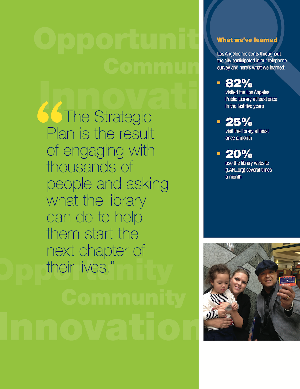Knowing that I might not get as much survey participation as I wanted, I turned to the work LAPL has already done in outlining their 5-year strategic plan for 2015-2020. In it they outline 6 major goals for their patrons, and for how the Library can contribute to the communities of Los Angeles.