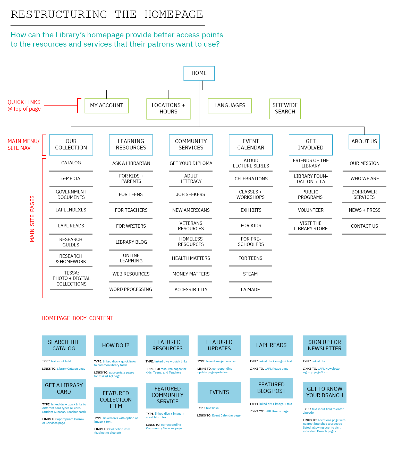 After revising LAPL’s homepage content and structure in spreadsheet form, I used diagramming and sketching to imagine what a more useful homepage content structure would be like in the abstract, for both the desktop and mobile version of the site.